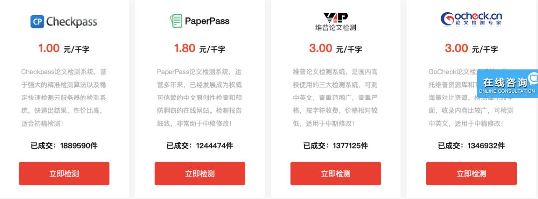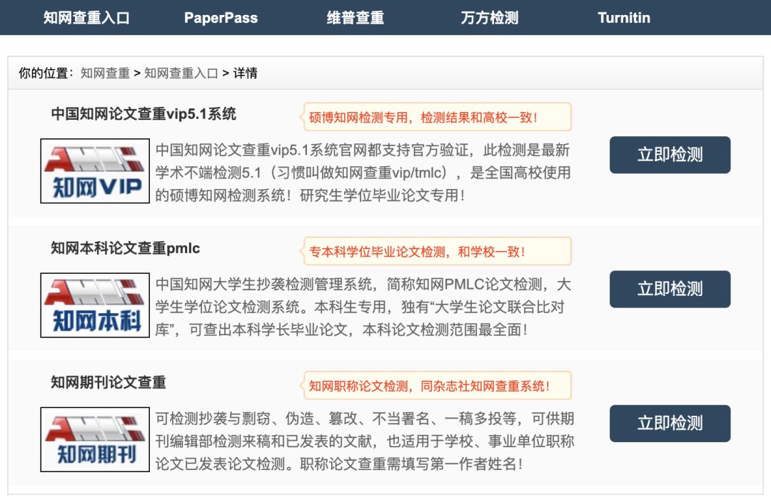 这个网站接入了各个权威论文查重网站的检测入口,很方便可以在这里直接用知网、PaperPass、Turnitin等等权威渠道检测。