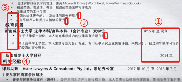 ① 没有写毕业时间、右边没有对齐 ② 文字描述后的标点符号时有时无 ③ 项目符号未对齐 ④ 标题没有对齐